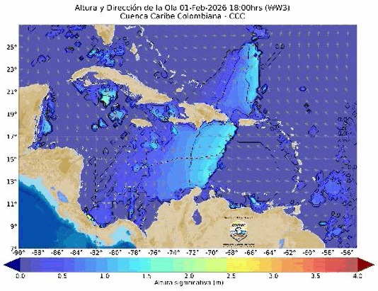 DIMAR advirtió que el periodo de mayor afectación se presentaría entre la tarde y la noche del domingo 1 de febrero, extendiéndose hasta la madrugada y la mañana del lunes 2 de febrero, cuando se esperan alturas significativas de ola de hasta 4 metros, especialmente en el suroeste del mar Caribe.