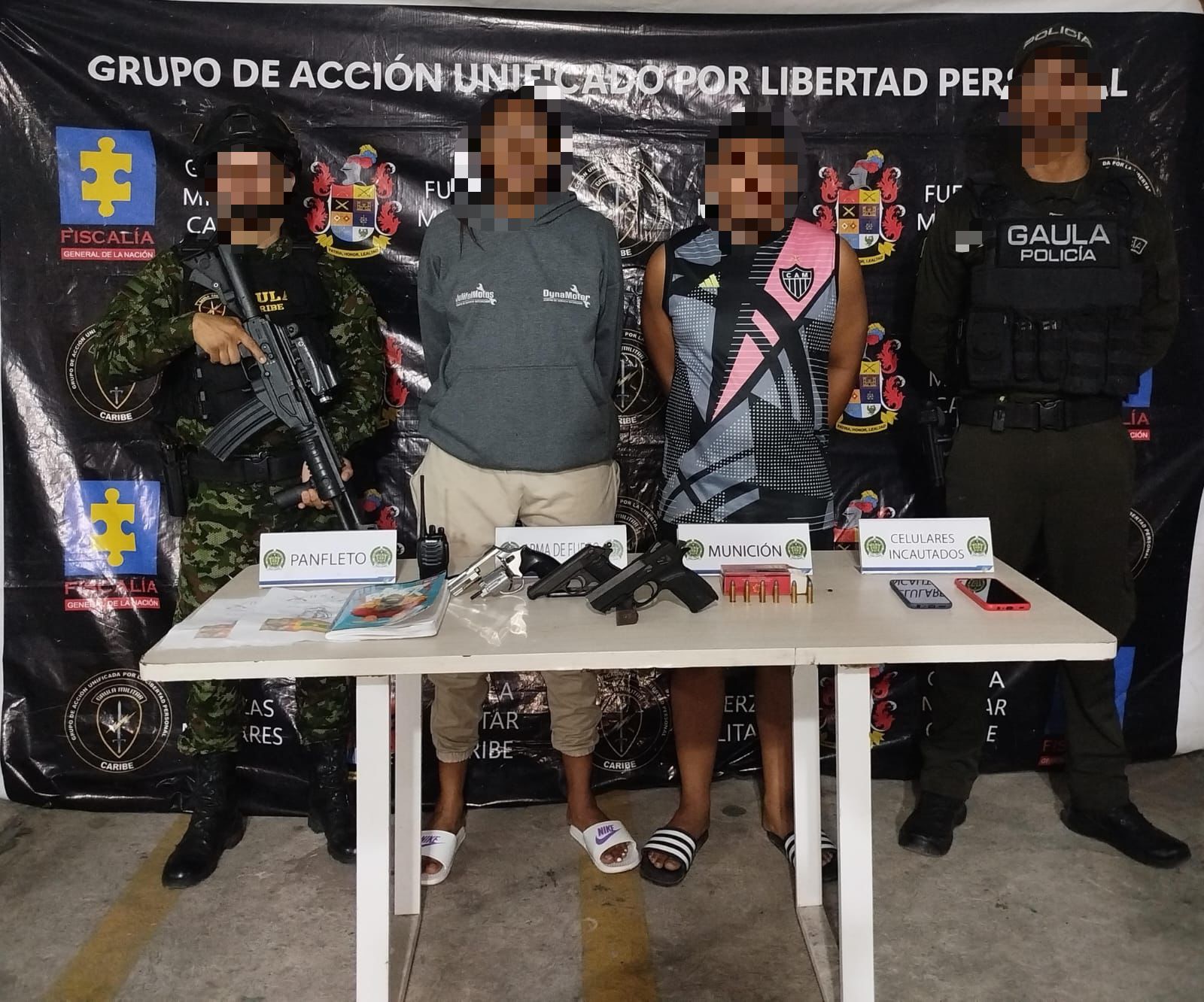 La acción, desarrollada por el Gaula Militar Caribe de la Segunda Brigada en coordinación con la Policía Nacional, permitió la captura de dos presuntos integrantes del grupo delincuencial organizado (GDO) Bloque Resistencia Caribe, conocido como ‘Los Costeños’. Los detenidos fueron puestos a disposición de las autoridades competentes para su respectivo proceso judicial.