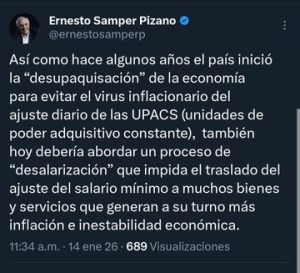 Samper recordó que esta medida sería similar a estrategias aplicadas en el pasado, cuando se llevó a cabo la denominada “desupaquisación” de la economía, destinada a frenar los efectos inflacionarios provocados por los ajustes diarios de las UPAC (Unidades de Poder Adquisitivo Constante).