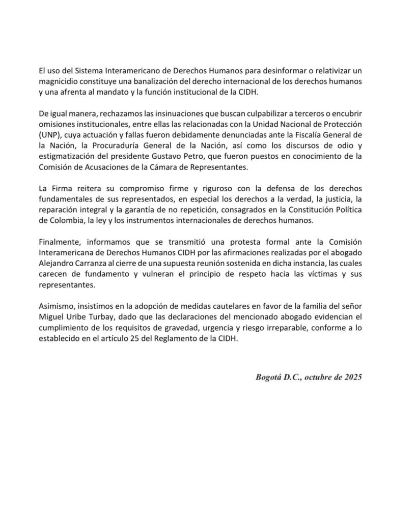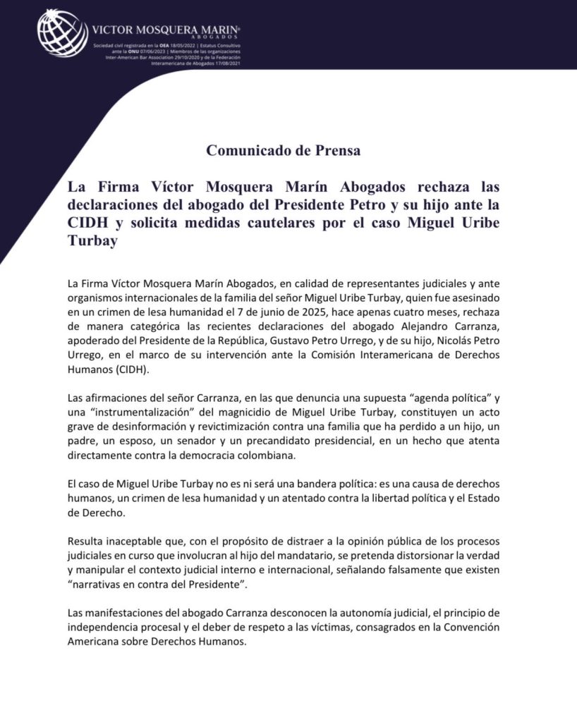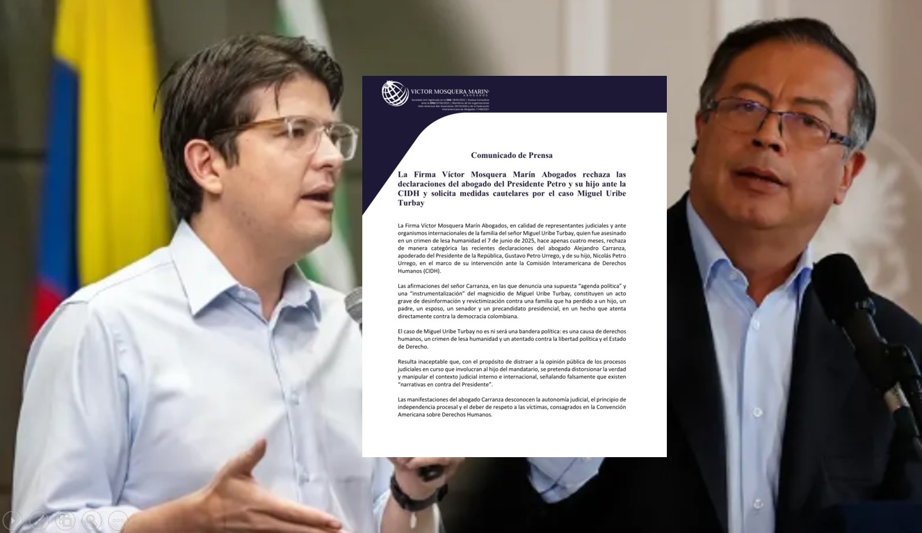 El abogado Víctor Mosquera, representante legal de la familia del senador Miguel Uribe Turbay, presentó una nueva queja formal ante la Comisión Interamericana de Derechos Humanos (CIDH) por los recientes señalamientos hechos por el abogado del presidente Gustavo Petro y de su hijo, Nicolás Petro. Mosquera aseguró que estos pronunciamientos podrían afectar el debido proceso y poner en riesgo la integridad de la investigación que busca esclarecer los hechos relacionados con el presunto magnicidio. Por tal motivo, el jurista solicitó a la CIDH medidas cautelares para garantizar la independencia y seguridad del proceso, así como la protección de los derechos de la familia Uribe Turbay. La petición se suma a una serie de acciones legales que el abogado ha venido adelantando ante organismos internacionales, insistiendo en que el Estado colombiano debe garantizar transparencia y protección a las víctimas dentro de las investigaciones. “Lo que pedimos es justicia sin presiones ni manipulaciones”, señaló Mosquera en su comunicación oficial.