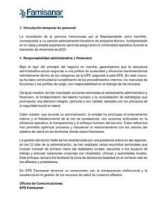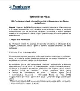 Luego de las denuncias realizadas por el representante a la Cámara Andrés Forero sobre presuntas irregularidades en contrataciones y elevados costos administrativos, la EPS Famisanar respondió que la información divulgada fue tomada de su sistema interno, pero no refleja de manera completa los perfiles profesionales, estudios y experiencia laboral de algunos de sus funcionarios.
