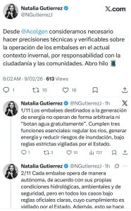 La líder gremial aseguró que “los embalses destinados a la generación de energía no operan de forma arbitraria ni ‘botan agua gratuitamente’”, y enfatizó que los vertimientos no son decisiones discrecionales de las empresas.