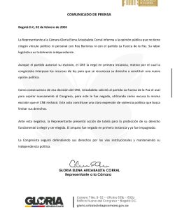 “Quiero dejar en claro que mi actuación política es autónoma y no tiene relación alguna con Roy Barreras ni con su partido. Rechazo cualquier intento de vinculación que afecte mis derechos como ciudadana y representante”, afirmó la congresista en el comunicado.