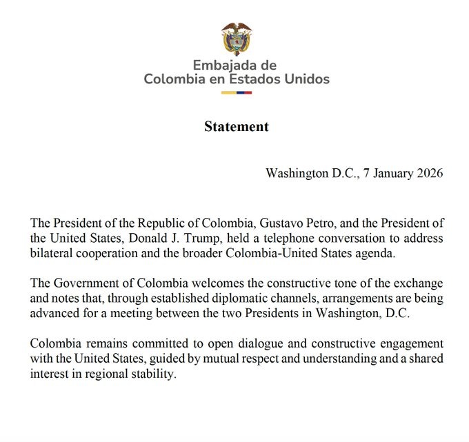 “Colombia se mantiene abierta al diálogo y al compromiso constructivo con Estados Unidos, guiado por el respeto mutuo y el entendimiento, con un interés en la estabilidad regional”, indicó el consulado colombiano.