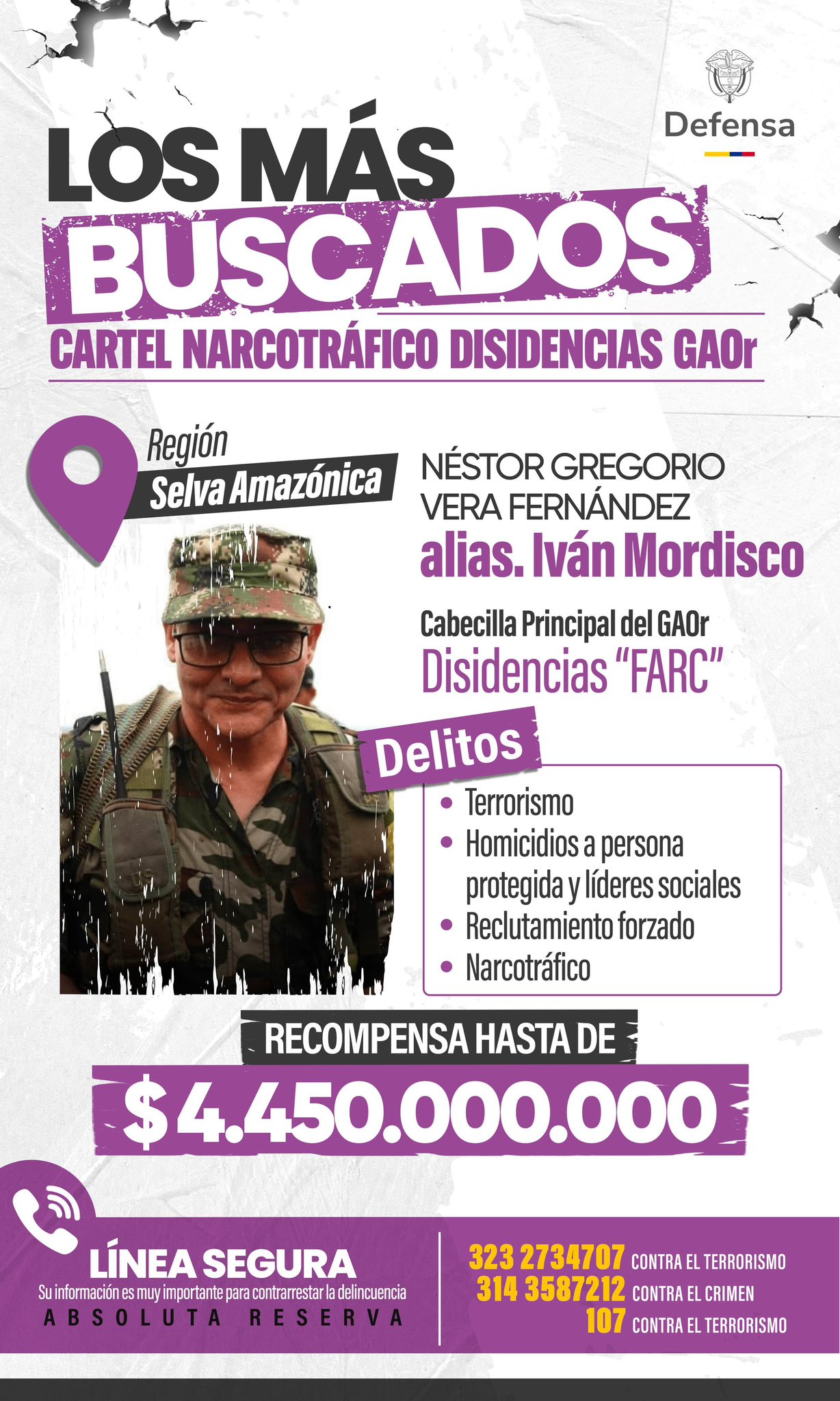 Adicionalmente, continúa vigente la recompensa de hasta $4.450 millones de pesos por alias ‘Mordisco’, considerado un objetivo de alto valor estratégico y máximo cabecilla de esta organización narcoterrorista.