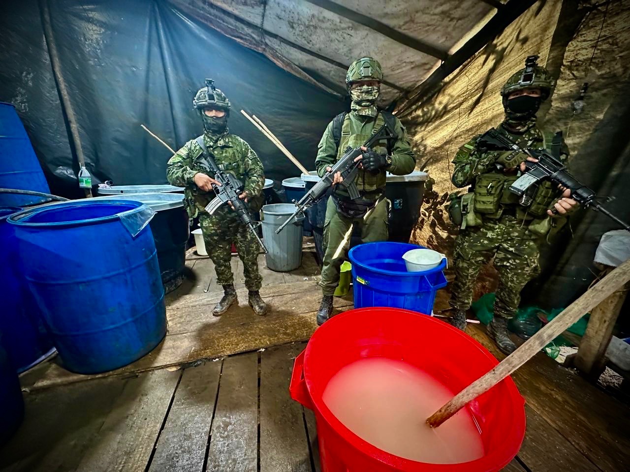 Según el reporte oficial, en el lugar fueron incautados más de 400 kilogramos de clorhidrato de cocaína, más de 1.500 galones de sustancia en suspensión, así como maquinaria e insumos utilizados para su procesamiento. La infraestructura contaba con seis estructuras y una capacidad de producción estimada de hasta una tonelada mensual de droga.