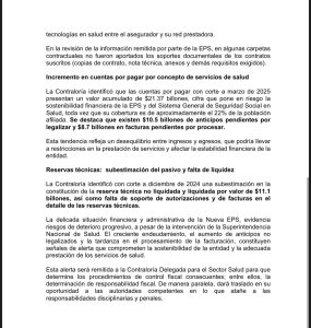 El ente de control fiscal expresó su preocupación por el posible impacto que esta situación podría generar en la red de prestadores, clínicas y hospitales, así como en la atención oportuna de millones de afiliados en todo el país.
