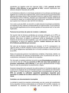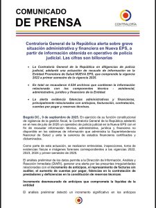 El ente de control fiscal expresó su preocupación por el posible impacto que esta situación podría generar en la red de prestadores, clínicas y hospitales, así como en la atención oportuna de millones de afiliados en todo el país.