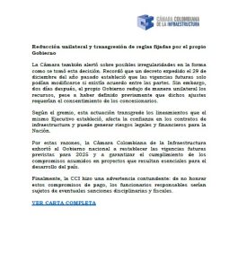 La CCI señaló que el recorte compromete el desarrollo de dos obras estratégicas para la conectividad y la mitigación de riesgos en el país, por lo que solicitó al Gobierno restablecer los recursos y honrar los compromisos adquiridos para garantizar la continuidad de los proyectos.