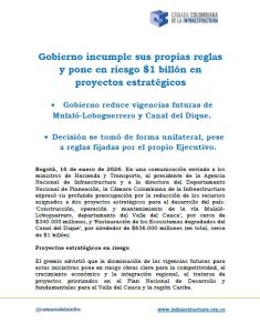 La Cámara Colombiana de la Infraestructura (CCI) advirtió que el Gobierno Nacional redujo de manera unilateral las vigencias futuras de los proyectos Mulaló–Loboguerrero y Canal del Dique, una decisión que pondría en riesgo recursos cercanos a $1 billón.