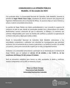 La Universidad Nacional, sede Medellín, confirmó mediante un comunicado el fallecimiento de Angie Pahola Tovar, estudiante de Ingeniería Administrativa, quien había sido secuestrada desde el pasado 27 de agosto.