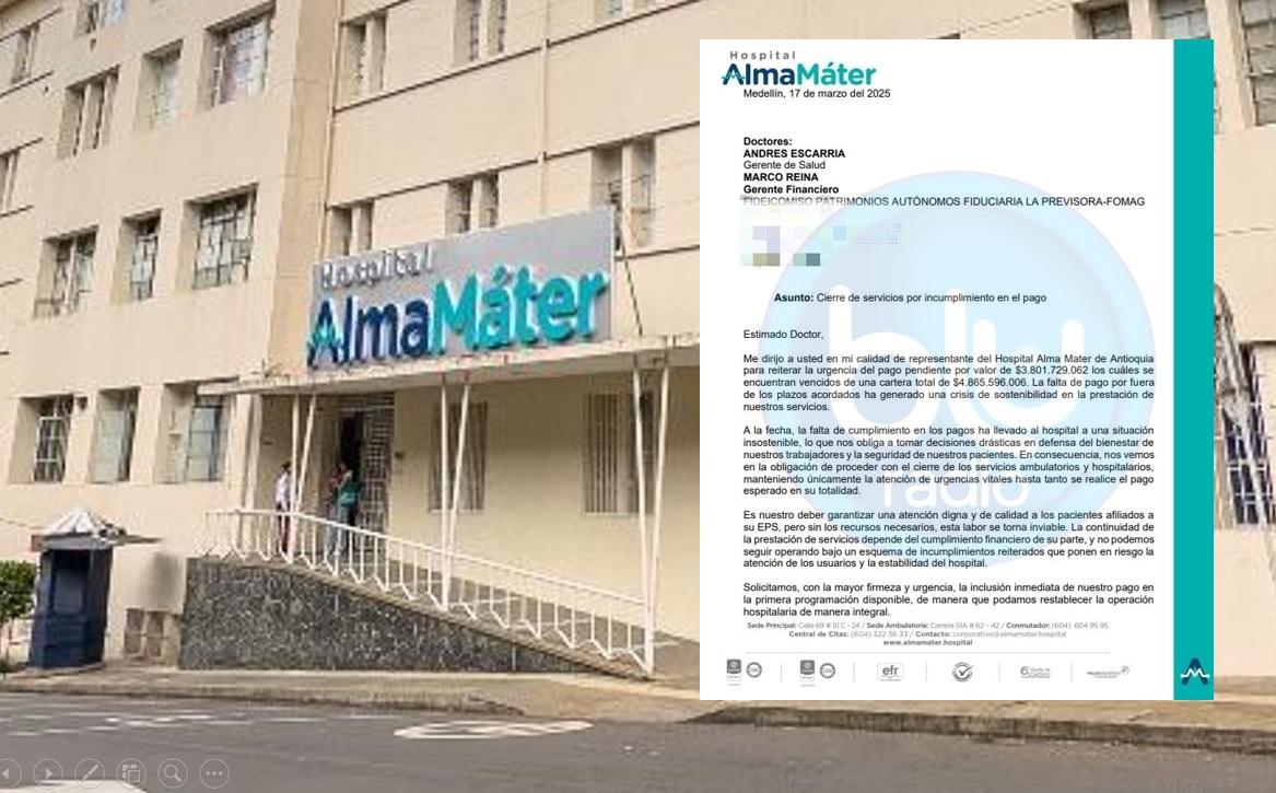 El Hospital Alma Mater de Medellín ha tomado la drástica decisión de suspender la atención médica a los docentes afiliados al sistema de salud del Magisterio debido a una deuda acumulada que asciende a casi 5.000 millones de pesos.