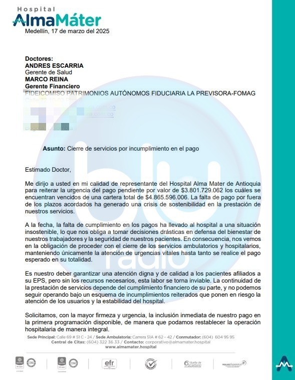 Según una carta enviada por el hospital, la cartera vencida es de 4.865 millones de pesos, lo que ha llevado a la institución a una situación financiera insostenible. El hospital argumenta que esta situación obliga a la institución a tomar medidas drásticas para proteger tanto el bienestar de los trabajadores como la seguridad de los pacientes.