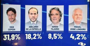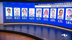 Por debajo del 2% aparecen: Juan Manuel Galán (1,6%), Aníbal Gaviria (1,3%), Enrique Peñalosa (1,1%), María Fernanda Cabal (1,1%), Paloma Valencia (1,1%) y Camilo Romero (1,0%).
