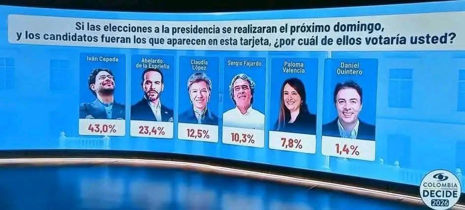 La encuesta también muestra un repunte de Claudia López, acercándola a los punteros, mientras que Sergio Fajardo y otros aspirantes mantienen cifras menores. La ventaja de Cepeda configura un escenario favorable para él rumbo a la primera vuelta programada para el 31 de mayo, aunque aún existe la posibilidad de una segunda vuelta si ningún candidato supera el umbral requerido por la ley.