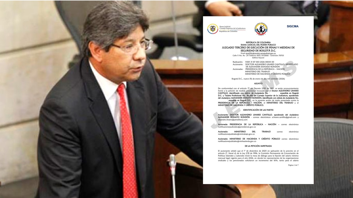 El juez tercero de Ejecución de Penas y Medidas de Seguridad de Bogotá rechazó la tutela presentada por el exmagistrado Alejandro Linares, quien buscaba suspender el decreto 1469 de 2025, que fijó un aumento del 23% en el salario mínimo para 2026.