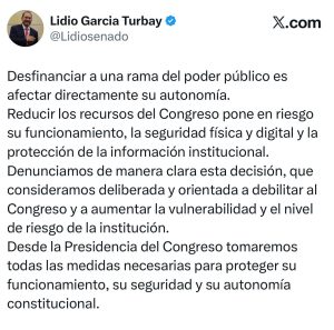 Según García, la decisión de reducir recursos destinados al Congreso es “deliberada y orientada a debilitar la institución y aumentar la vulnerabilidad y el nivel de riesgo” de los servidores públicos y parlamentarios.