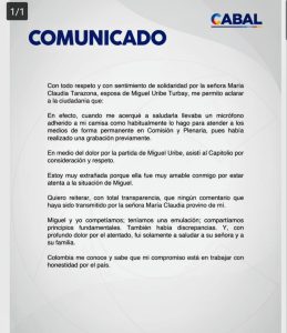 La senadora del Centro Democrático, María Fernanda Cabal, respondió este sábado a versiones que circularon en redes sociales sobre un presunto incidente con María Claudia Tarazona, esposa del también senador Miguel Uribe Turbay.