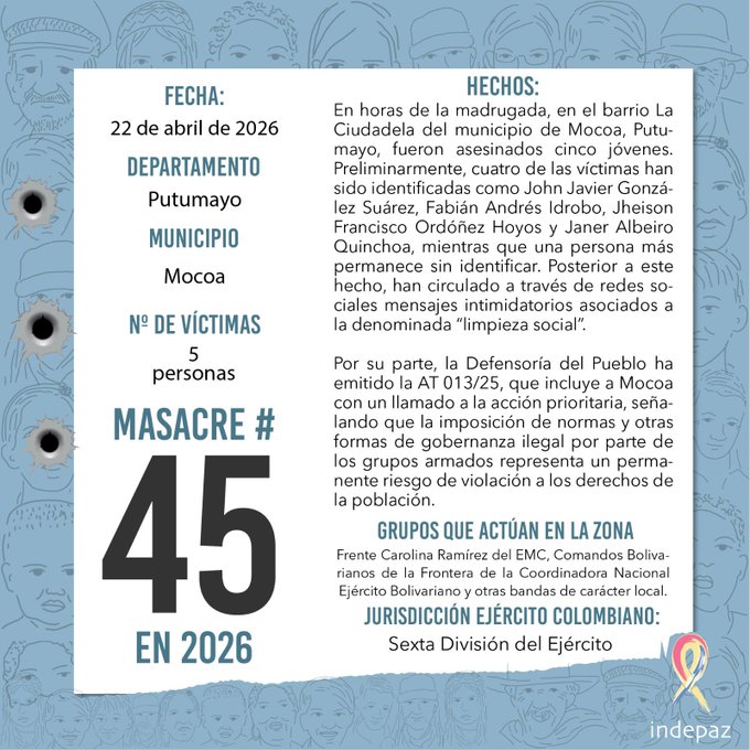 Según reportes de Indepaz, este hecho se convierte en la masacre número 45 registrada en el país en lo que va del año. Además, en redes sociales han circulado mensajes intimidatorios que relacionarían el crimen con supuestas acciones de “limpieza social”.