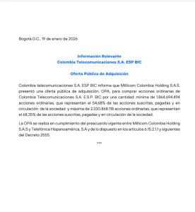 Colombia Telecomunicaciones S.A. E.S.P. BIC informó que Millicom Colombia Holding S.A.S. presentó oficialmente una Oferta Pública de Adquisición (OPA) para comprar acciones ordinarias de la compañía, con el objetivo de alcanzar una participación mayoritaria.