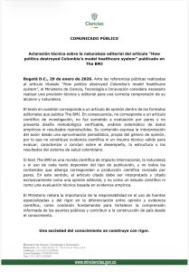 MinCiencias aclara que artículo publicado en The BMJ sobre el sistema de salud es un texto de opinión