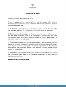 El Ministerio de Defensa Nacional emitió un comunicado en el que informó las razones por las cuales fue retirada la hoja de vida del teniente coronel en retiro Francés Orlando Reyes Rodríguez, quien aspiraba a ocupar un cargo como asesor dentro de la entidad. Según el documento oficial, la decisión fue adoptada “en el marco del compromiso institucional con los más altos estándares éticos y de transparencia”, subrayando que toda vinculación al sector Defensa debe basarse en el mérito, la idoneidad y la integridad moral de los aspirantes. “Esta determinación se adopta garantizando que la selección de personal se realice bajo principios de mérito y transparencia”, señaló el Ministerio. La cartera de Defensa no entregó detalles adicionales sobre los motivos específicos que llevaron a descartar la postulación del oficial en retiro, pero reiteró su compromiso con la probidad y la confianza pública en los procesos de vinculación dentro del sector.