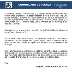 El Centro Democrático emitió un comunicado solicitando que se adelante una investigación rigurosa para esclarecer los motivos por los cuales la mujer portaba un arma en un evento político. “Solicitamos a las autoridades competentes adelantar de manera inmediata una investigación que permita esclarecer los motivos por los cuales esta persona armada hacía presencia en ese lugar”, señaló la misiva del partido.