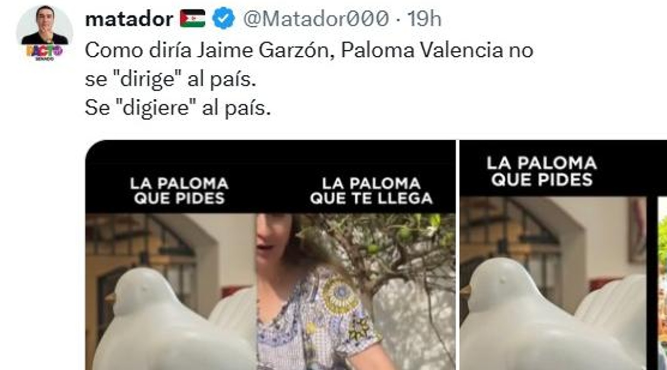 La polémica en torno a la candidata presidencial del Centro Democrático, Paloma Valencia, escaló este martes luego de que Julio César González, alias Matador, candidato al Senado por el Pacto Histórico, publicara mensajes y caricaturas burlándose del físico de la aspirante. En uno de sus trinos, González escribió que Valencia “no se dirige al país, se digiere al país”, acompañando la frase con una imagen que la comparaba con una escultura de Fernando Botero. Posteriormente, difundió un video animado con expresiones ofensivas sobre la candidata mientras comía.