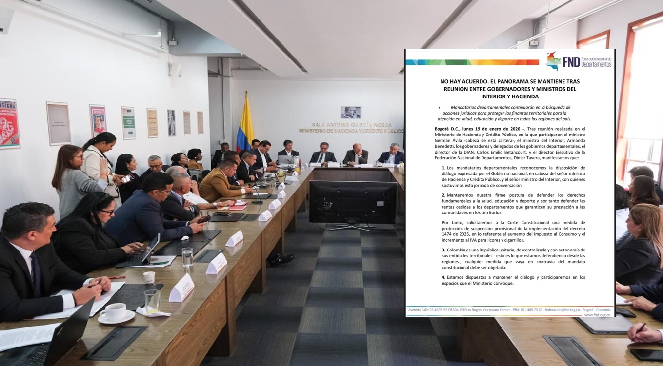 La reunión entre los gobernadores del país y los ministros de Hacienda, Germán Ávila, y del Interior, Armando Benedetti, terminó sin acuerdos frente al impacto fiscal del Decreto 1474 de 2025, que incrementa el Impuesto al Consumo y el IVA a licores y cigarrillos.