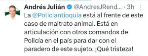 La Gobernación de Antioquia anunció una recompensa de hasta 50 millones de pesos para quien entregue información que permita ubicar al responsable de este acto de maltrato animal.