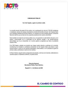 “El senador Iván Cepeda es el único aspirante presidencial del Pacto Histórico. En caso de que no sea posible su participación en la consulta, la Dirección Nacional procederá a su inscripción como candidato presidencial para enfrentar y ganar la primera vuelta”, indicó la colectividad.