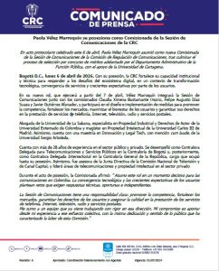 La economista Paola Vélez Marroquín se posesionó como nueva comisionada de la Comisión de Regulación de Comunicaciones, entidad encargada de regular los servicios de telecomunicaciones, televisión y servicios postales en el país.