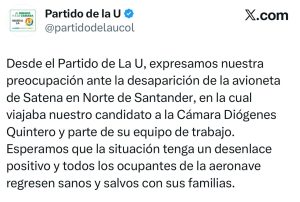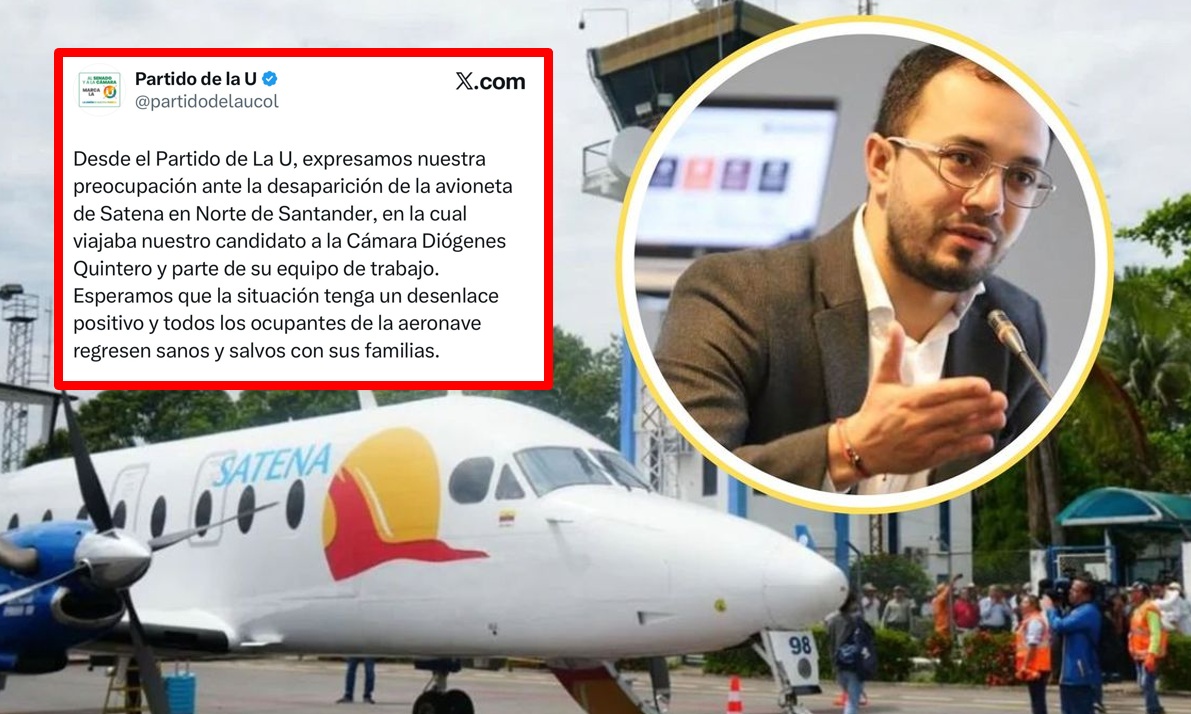 El Partido de la U expresó su preocupación tras conocerse la desaparición de la avión en la que viajaba Diógenes Quintero, su candidato a la Cámara de Representantes y actual congresista.
