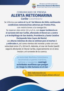 De acuerdo con la autoridad marítima, la afectación se extenderá entre el 3 y el 7 de febrero, periodo durante el cual se recomienda extremar las medidas de seguridad, especialmente en el litoral centro y sur del Caribe, así como en el Archipiélago de San Andrés, Providencia y Santa Catalina.