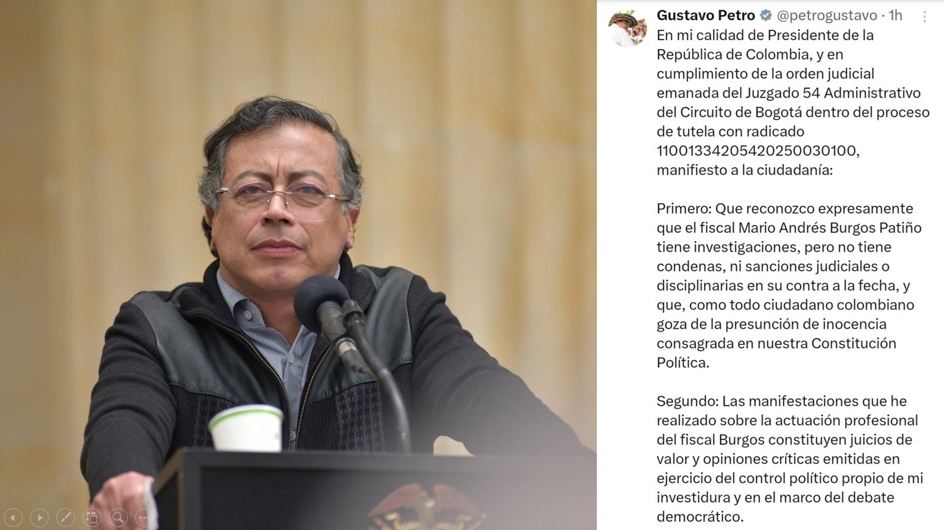 El presidente Gustavo Petro cumplió este miércoles la orden del Tribunal Administrativo de Cundinamarca, retractándose públicamente de sus declaraciones contra el fiscal Mario Andrés Burgos Patiño, a quien había señalado sin pruebas de supuestos vínculos con el narcotráfico y de favorecer a implicados en el asesinato del fiscal paraguayo Marcelo Pecci.