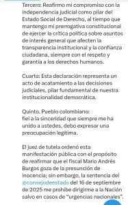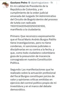 “Reconozco expresamente que el fiscal Mario Andrés Burgos Patiño tiene investigaciones, pero no tiene condenas, ni sanciones judiciales o disciplinarias en su contra a la fecha, y que, como todo ciudadano colombiano, goza de la presunción de inocencia consagrada en nuestra Constitución Política”, afirmó el mandatario.