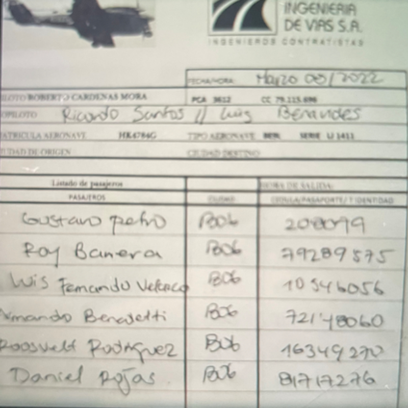 El documento, donde obligatoriamente se registran los nombres de los pasajeros, está fechado el 8 de marzo de 2022, y tiene el logo de la empresa Ingeniería de Vías de propiedad del ingeniero Pedro Contecha. Diez meses después, cuando Petro estaba en la Presidencia, el constructor recibió un contrato por 60 mil millones a dedo para atender la emergencia de la vía Rosas-Cauca a inicios de 2023. Ese contrato fue adicionado en 28 mil millones varios meses después.