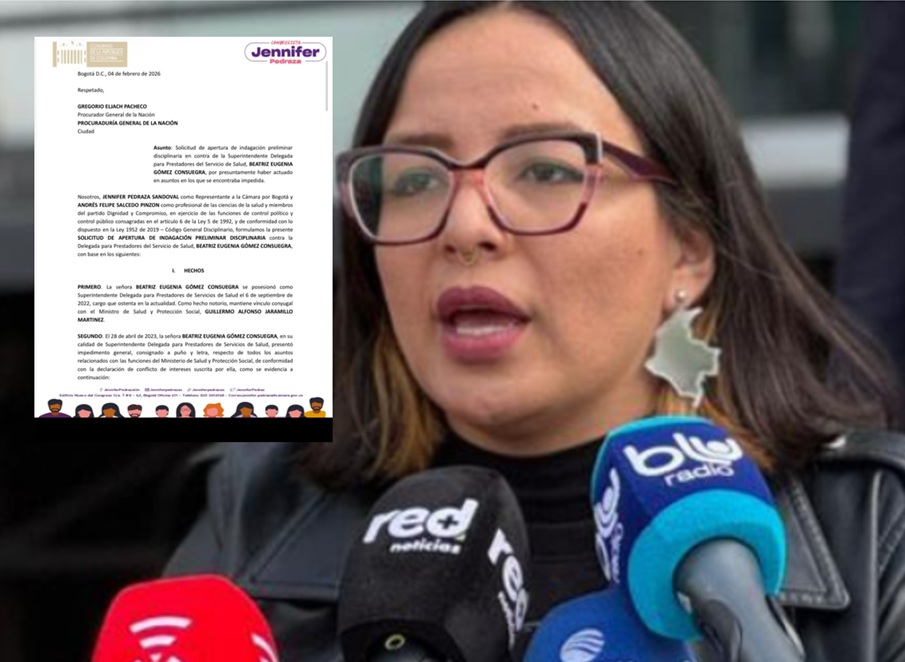 La representante a la Cámara, Jennifer Pedraza, elevó una denuncia formal ante la Procuraduría General de la Nación contra Beatriz Gómez Consuegra, superintendente delegada de Salud y esposa del ministro de Salud, Guillermo Alfonso Jaramillo, por una presunta intervención indebida en procesos administrativos de hospitales y EPS.
