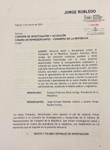Jorge Enrique Robledo radicó una denuncia penal y disciplinaria ante la Comisión de Acusaciones de la Cámara de Representantes contra el presidente Gustavo Petro, con el fin de ampliar la denuncia presentada por más de 200 organizaciones de pacientes contra el ministro de Salud, Guillermo Alfonso Jaramillo, por la crisis que enfrenta el sistema de salud.