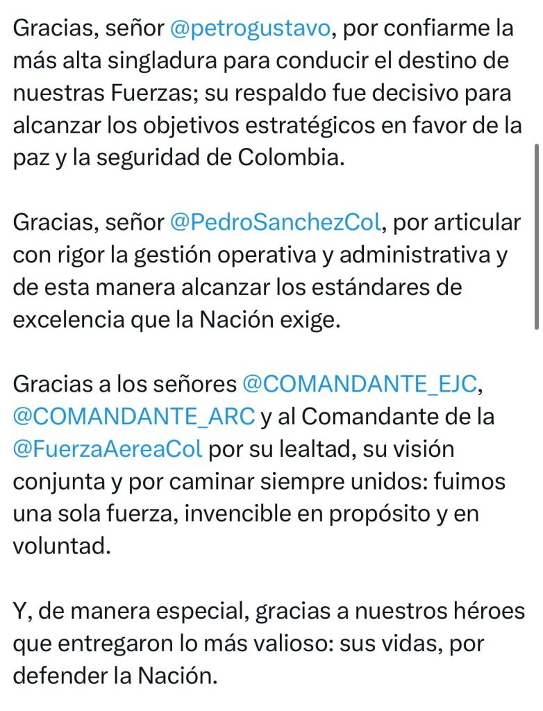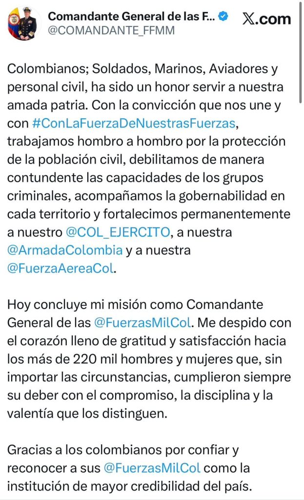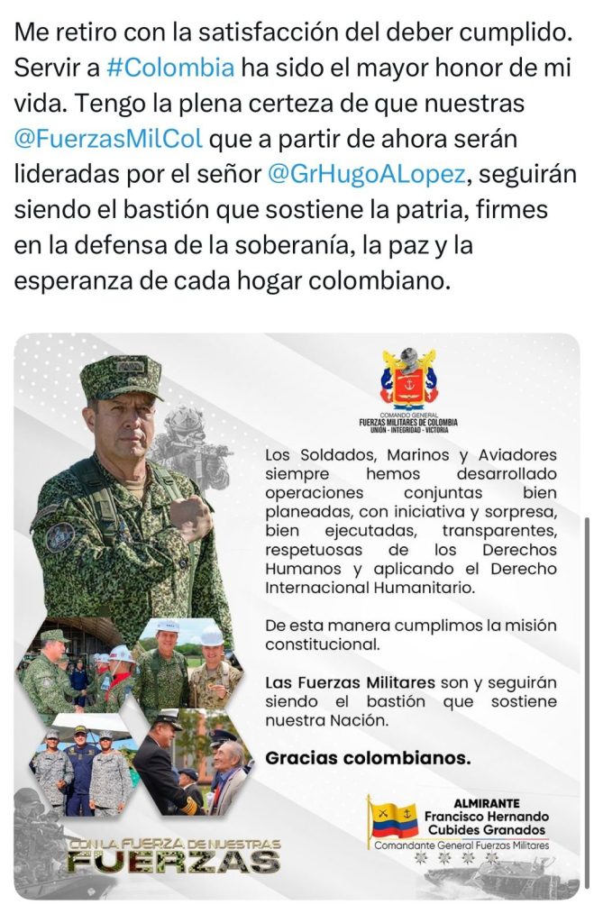 En su mensaje de despedida, aseguró que ha sido un “honor servir a nuestra amada patria” y expresó su satisfacción por el deber cumplido. “Me retiro con la satisfacción del deber cumplido. Servir a Colombia ha sido el mayor honor de mi vida”, escribió Cubides, dejando un mensaje de compromiso y patriotismo que resonó entre sus colegas y la sociedad en general. El relevo en el comando de las Fuerzas Militares marca un nuevo capítulo en la institución, mientras se reconocen los años de trayectoria y liderazgo del almirante saliente.