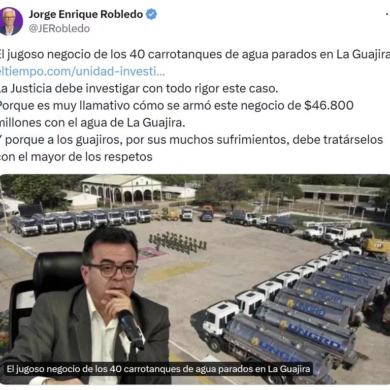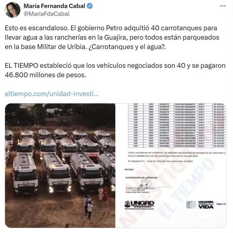 Varios políticos cuestionaron el contrato de carrotanques en La Guajira – crédito X“Huele mal el ‘negocio’ de carrotanques para La Guajira. ¿Se repite la historia de los recolectores de basura de Bogotá, que se pudrieron en un potrero?”, sostuvo por su parte el exsenador Ernesto Macías.