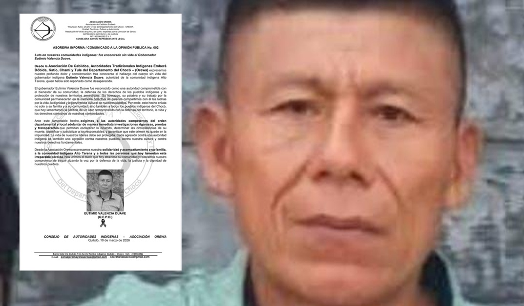 La Asociación de Cabildos y Autoridades Tradicionales Indígenas del Chocó (Orewa) confirmó el hallazgo del cuerpo del líder, quien había sido reportado como desaparecido tras ser interceptado por tres hombres armados en una carretera que conduce al municipio de Tadó, en el sur de ese departamento.