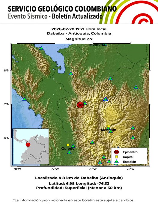 Un evento sísmico de magnitud 2.7 se registró este 20 de febrero de 2026 a las 5:21 p. m. (hora local) en el municipio de Dabeiba, en el departamento de Antioquia.