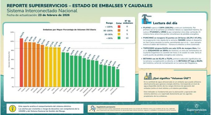 La Superintendencia de Servicios Públicos Domiciliarios advirtió que los ríos Sinú, Sogamoso e Ituango mantienen aportes hídricos extraordinarios, con caudales muy por encima de sus promedios históricos, lo que obliga al sistema eléctrico a gestionar excedentes de agua en varios embalses del país.