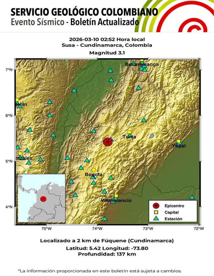 Colombia es un país con actividad sísmica constante debido a su ubicación geológica, en la zona donde interactúan varias placas tectónicas. Por esta razón, el monitoreo permanente de los movimientos de la tierra es una tarea que realiza el Servicio Geológico Colombiano, a través de su red nacional de estaciones sismológicas, con el objetivo de garantizar la seguridad de la población y la pronta respuesta ante posibles emergencias.#SismosColombiaSGC Evento Sísmico – Boletín Actualizado 1, 2026-03-10, 02:52 hora local Magnitud 3.1, Profundidad 137 km, Susa – Cundinamarca, Colombia ¿Sintió este sismo? repórtelo https://t.co/pgC7OC2O7j https://t.co/63pt8nVsSe #NoticiaEnDesarrollo #Temblor pic.twitter.com/D9H8scREbO