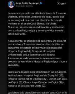 El accidente también dejó un total de 21 personas lesionadas, de las cuales 19 son adultos y dos menores de edad. Uno de los heridos permanece en estado crítico y fue remitido al Hospital Universitario de La Samaritana, mientras otros pacientes continúan recibiendo atención en diferentes centros médicos de la región.