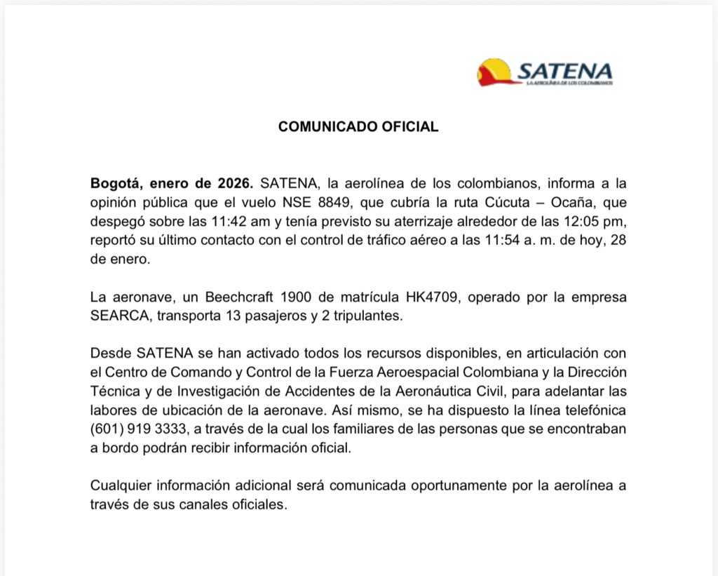 La ministra de Transporte, María Fernanda Rojas, informó que la Dirección de Investigación de Accidentes de la Aerocivil “se encuentra recogiendo información respecto a la pérdida de comunicación de la aeronave HK4709 que cubre la ruta Cúcuta-Ocaña con 13 pasajeros y 3 tripulantes”.