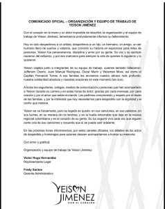 “Hoy no solo despedimos a un artista; despedimos a un hijo, un hermano, un amigo. Un ser humano lleno de sueños y valentía que convirtió su historia en esperanza para miles de personas”, señala el comunicado.