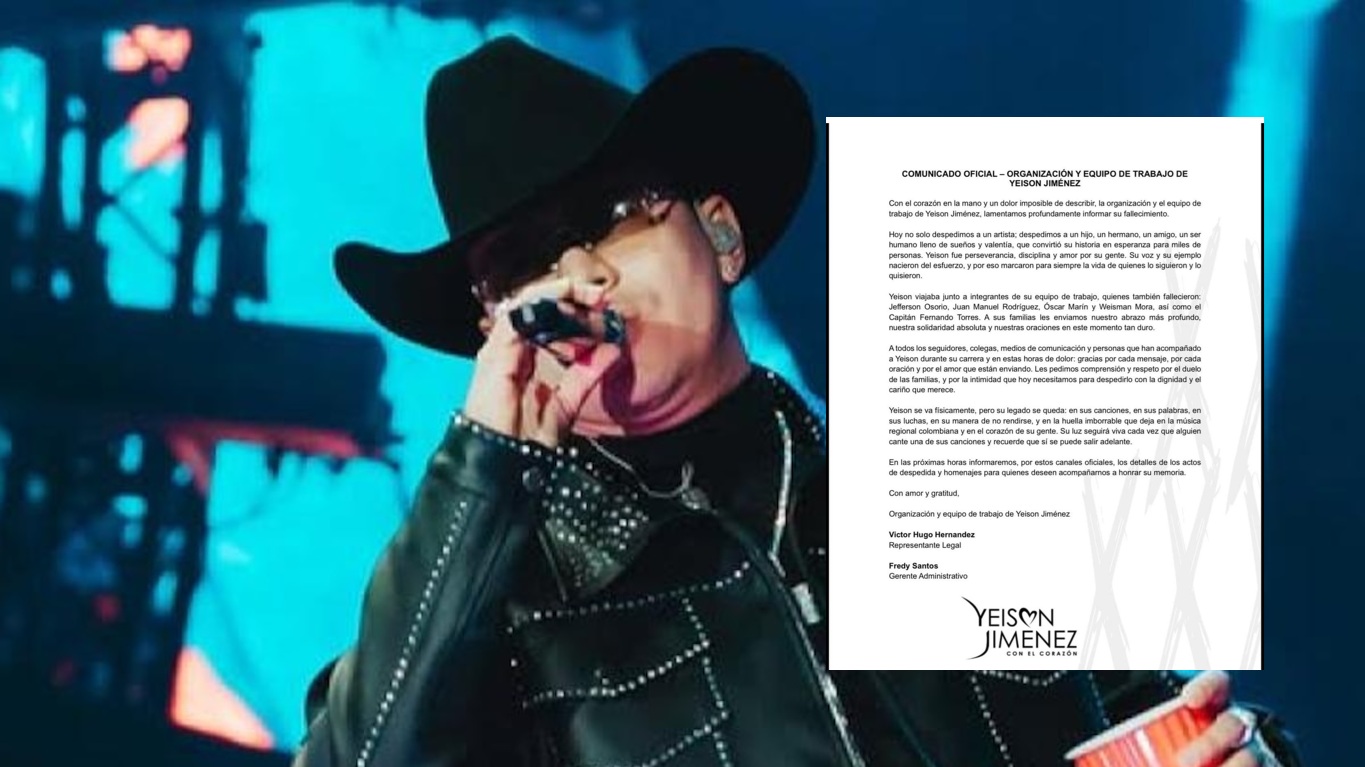 La Organización Yeison Jiménez expresó su profundo dolor por el fallecimiento del cantante y de los integrantes de su equipo de trabajo, tras la tragedia que enluta a la música popular colombiana.