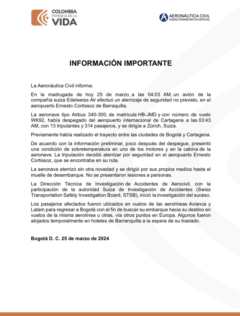Según informó la Aeronáutica Civil en un comunicado, el vuelo WK92, operado con un Airbus 340-300 de la aerolínea Edelweiss Air, había despegado del aeropuerto internacional de Cartagena con destino a Zúrich, Suiza, con 13 miembros de la tripulación y 314 pasajeros a bordo.